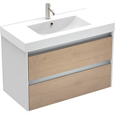LeVivi Capri 900mm Vanity: Modern wall-hung design in White/Ranfurly Oak. Gloss top, soft-close drawers, 10-year warranty. Tailor to your style!