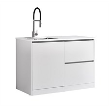 LeVivi Laundry Station: 1300mm, LH Door, RH Drawers, White. Waterproof, 5-year warranty, engineered stone top, undermount sink. Exclusive to Plumbing World.