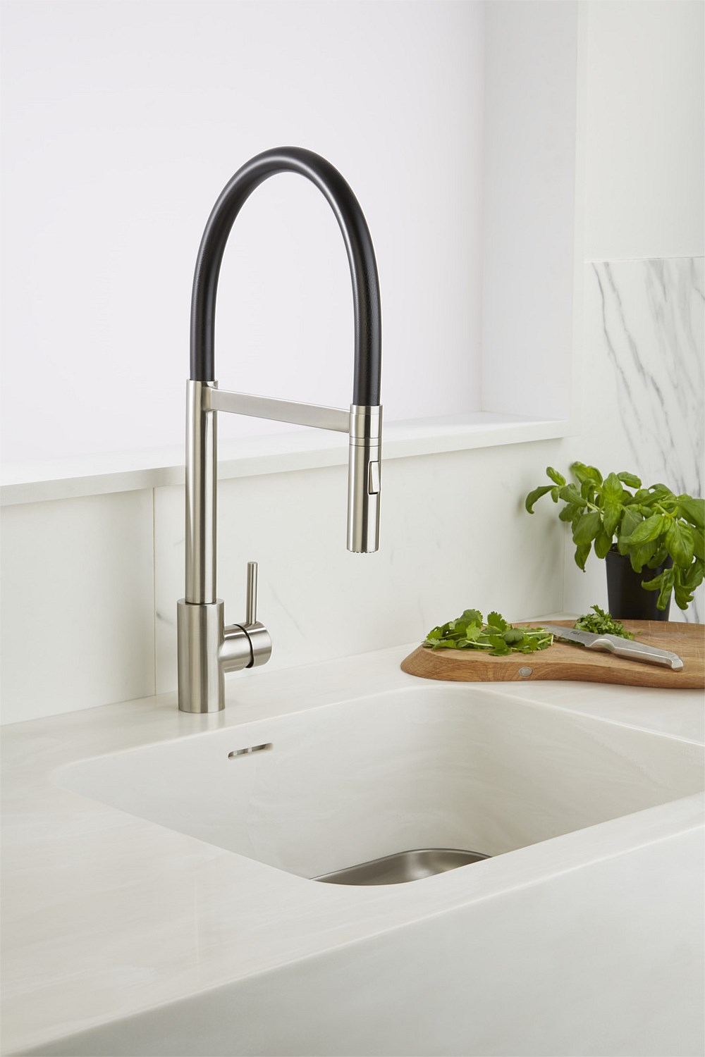 LeVivi Aspen Gooseneck Sink Mixer with Flexi-Hose Stainless Steel with Black or White Hose
